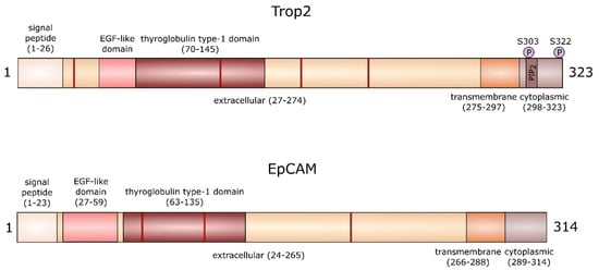 Trophoblast cell surface antigen 2 (Trop2) was first described in 1981 as a protein highly expressed on the surface of trophoblast cells [1]. It is also known as EGP-1, M1S1, and GA733-1 [2]. Trop2 is encoded by the TACSTD2 (tumor-associated calcium signal transducer 2) gene, which is a member of the TACSTD gene family [3,4]. The second member of this family, TACSTD1 (also known as EpCAM), encodes epithelial cell adhesion molecule (EpCAM). Trop2 and EpCAM share 49% identity and 67% similarity of amino acid sequence with highly similar distribution of hydrophilic and hydrophobic residues [5,6]. The results of sequence analysis suggest that in the evolution of TACSTD gene family exon shuffling occurred, since some exons of TACSTD genes are homologous to exons of genes coding for thyroglobulin, HLA-DR-associated invariant chain, and probably nidogen [7]. All nine exons of TACSTD1 are represented in the intronless TACSTD2, suggesting that it was formed by retroposition via an mRNA intermediate. This retroposition preceded the divergence of avian and mammalian lineages, thus TACSTD genes are more than 300 million years old. Both TACSTD1 and TACSTD2 genes are highly conserved across species [7,8]. Examples of species with TACSTD2 include mice, chimpanzees, goats, sheep, chickens, and many others according to the Uniprot search [9]. In humans, the intronless TACSTD2 gene is located on chromosome 1 in 1p32 locus [3].