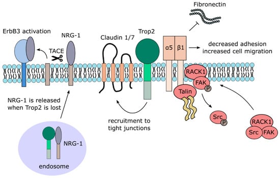 Trop2 also exhibits tumor suppressive functions in cervical cancer cells, where it similarly inhibits the activation of IGF-1R and anaplastic lymphoma kinase (ALK), possibly through binding to their ligands IGF-1 and midkine (MDK) [77]. Another such example is the reduced or completely lost expression of Trop2 in the mesenchymal subtype of squamous head-and-neck carcinoma [35]. Decreased Trop2 expression leads to increased phosphorylation of the ErbB3 receptor, also known as HER3, in this cancer type. As Trop2 interacts with neuregulin-1 (NRG-1), a ligand of ErbB3, inactivation of Trop2 increases the concentration of NRG-1 on the cell surface, which is then cleaved by metalloproteinase TACE [65]. The released extracellular domain of NRG-1 then activates ErbB3, promoting cell proliferation and tumor growth (Figure 2). Squamous cell carcinomas are characterized by a gradual loss of Trop2 during progression, inversely proportional to ErbB3 [64]. Interestingly, resistance to anti-ErbB3 treatment in head-and-neck squamous cell carcinoma is associated with increased Trop2 protein expression [63]. Co-treatment with both anti-ErbB3 and anti-Trop2 antibodies leads to a greater anti-tumor response than either antibody alone.