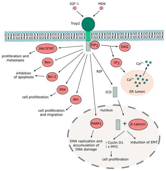 Despite the fact that Trop2 is considered a transmembrane protein, it can also be localized in the cytoplasm with possible functional consequences [42,65,76]. Cytoplasmic, but not membrane-bound Trop2, expression positively correlates with phospho-Akt in breast cancer specimens [59]. Stoyanova et al. reported that Trop2 undergoes regulated intramembrane proteolysis (RIP) [67]. During RIP, the extracellular domain is cleaved, whereas the intracellular domain is released and enters the nucleus, where it accumulates in complex with β-catenin that then activates transcription of downstream targets. The extracellular domain of Trop2 is cleaved by metalloproteinase tumor necrosis factor-α converting enzyme (TACE), while the intracellular domain (ICD) is cleaved predominantly by presenilin-1 but also by presenilin-2. Interestingly, Trop2 ICD has been found in human prostate cancer cells but not in benign prostate tissues, suggesting its role in tumorigenesis [67]. Physical interaction of Trop2 and β-catenin was also observed in gastric cancer cell lines, where Trop2 is required for β-catenin nuclear accumulation and is associated with induction of EMT [66]. However, further studies are needed to identify the exact mechanisms that regulate processing, cellular localization, and posttranslational modifications of Trop2 and to clarify their effects on the biological function of Trop2.