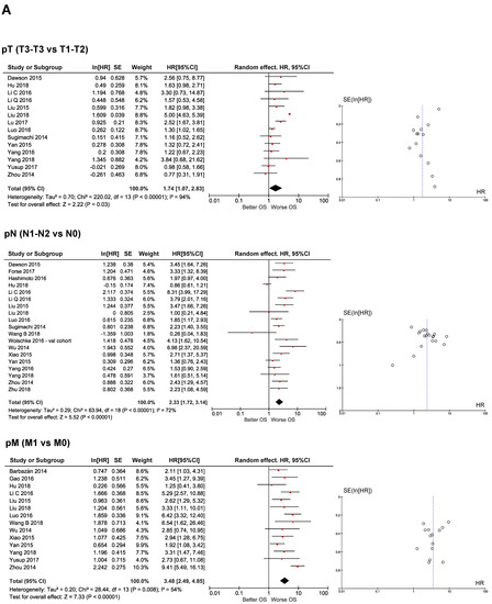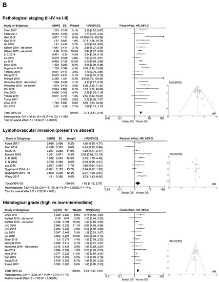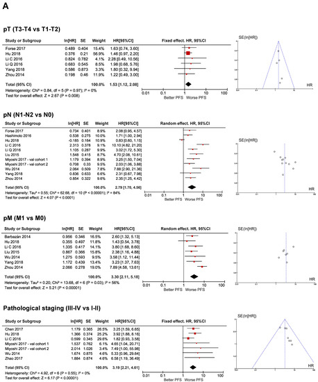 There were a major number of studies predicting OS than PFS, which was the reason why we found more clinical biomarkers associated to the OS than to PFS. Pathological factors such as pT, pN, pM, pStage, LVI and HG were identified as strongly significantly affecting both OS and PFS (Figure 2A,B and Figure 3A,B), while chemotherapy was only found to be significantly associated to OS. Tumor size and tumor location were not significantly associated to any survival endpoint (Figure 2C). The test of heterogeneity confirmed homogeneity in pStage and HG in predicting both OS (Figure 2A) and PFS (Figure 3A,B), while meta-analysis of pT and LVI were homogenous only in predicting PFS (Figure 3A,B). In these cases, the symmetric distribution of funnel plot shapes demonstrated a low risk of publication bias. In contrast, variables such as pN, pM, tumor location, tumor size and chemotherapy showed heterogeneity in their prediction, suggesting a high risk of publication bias (Figure 2A–C and Figure 3A). Fixed or random effect models were applied accordingly.