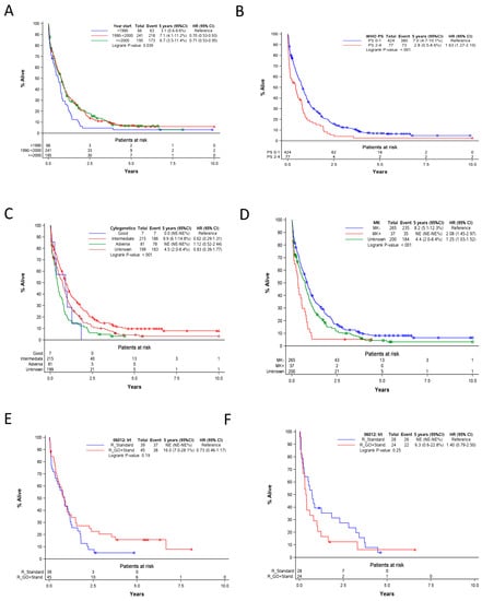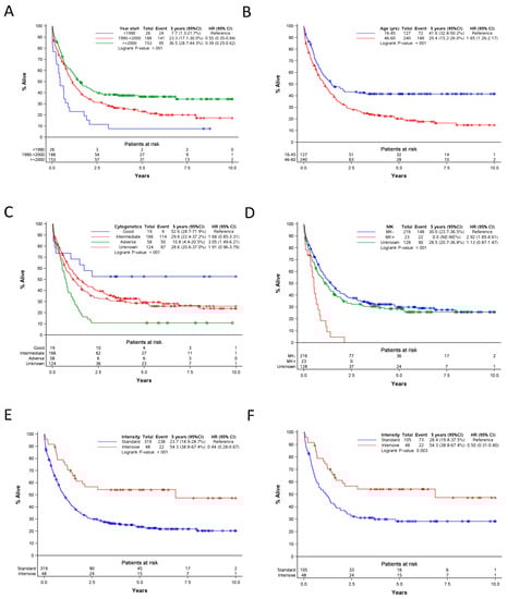 - Canaani, J.; Beohou, E.; Labopin, M.; Ghavamzadeh, A.; Beelen, D.; Hamladji, R.M.; Niederwieser, D.; Volin, L.; Markiewicz, M.; Arnold, R.; et al. Trends in patient outcome over the past two decades following allogeneic stem cell transplantation for acute myeloid leukaemia: An ALWP/EBMT analysis. J. Intern. Med. 2019, 285, 407–418. [Google Scholar] [CrossRef]