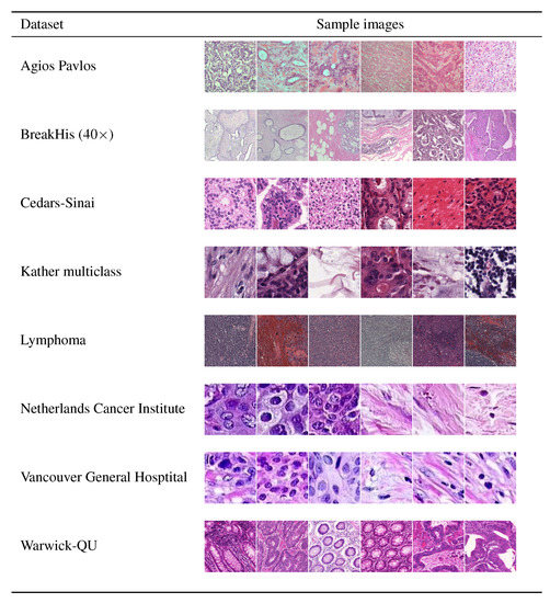It should be noted that the images considered in this work are considerably smaller than those provided by whole-slide scanners [50,51]. Images from whole-slide scanners can span tens or hundreds of thousands of pixels, and these are typically cropped into smaller tiles and thus very large number of images can be used for studies. For reproducibility, we used the nine publicly available datasets described above.