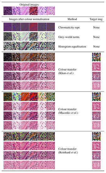 For color transfer we considered the methodologies of Khan et al. [22], Macenko et al. [25] and Reinhard et al. [56], each with four different target images denoted as T1–T4 in the remainder (see also Figure 4). Three of these images (T2–T4) are histology images, and one (T1) is not. For the latter we selected a color calibration mask (colour checker), which is an image with a large variation of colors not related to histology. The rationale was to investigate how widely the colors of the original image could vary if those of the target image were markedly different. For the implementation we used the functions available in Warwick’s Stain Normalization Toolbox [53]. Figure 4 illustrates the effects of each color normalisation methods on a set of sample images.