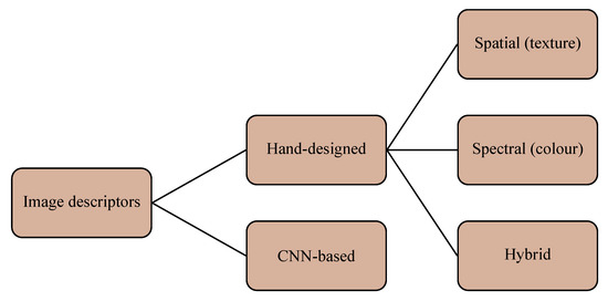 The image descriptors that can be used for histological image analysis fall into two main categories: the traditional, ‘hand-designed’ methods on the one hand and the convolutional networks (CNN) on the other [60]. The first group can be further subdivided into spatial (texture), spectral (color) and hybrid methods [61] (Figure 5). For this study we considered eight ‘hand-designed’ descriptors and five pre-trained convolutional networks as detailed below.