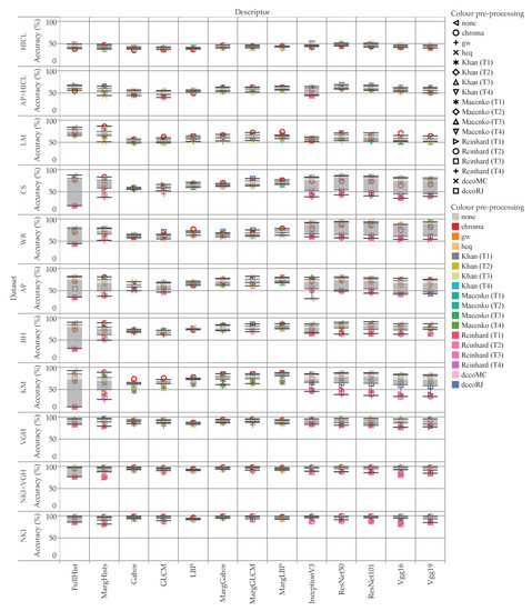 Figure 6 shows the accuracy for each descriptor and data set, while color indicates the pre-processing methodology. As can be observed, the performance of the color-based descriptors (i.e.: color histograms and pre-trained networks) varied significantly depending on the pre-processing method used. By contrast, the texture-based descriptors were markedly more resilient, as one would reasonably expect. Also, it should be noted that the marginal versions of the texture descriptors (MargGabor, MargGLCM and MargLBP) outperformed their grey-scale counterparts (Gabor, GLCM and LBP).