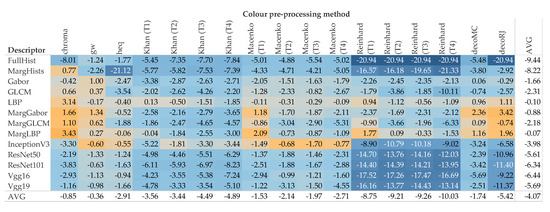 Difference to the baseline by image descriptor and pre-processing method. The values are averaged over the eight data set and filtered on . Baseline is the condition where no color pre-processing is applied.