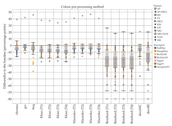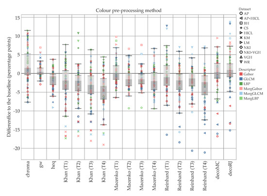 Difference to the baseline for each of the color pre-processing methodologies (texture and hybrid hand-designed descriptors). Color shows details about descriptor, shape about data set. The data are filtered on . The zero line represents the condition where no color pre-processing was applied. The use of color pre-processing caused loss of accuracy in the majority of the cases: the median of 12 of the 17 methodologies was below the baseline, and the upper quartile of 11 of the 17 was close or below the baseline. It should be noted that for both Macenko and Reinhard, the best results were recorded when T1—i.e., the non-histological target—was used. Ruifrok and Johnston’s (decoRJ) was among the highest results, together with the relatively simpler chroma and gw.