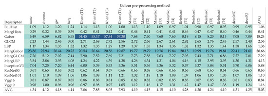 Figure 10 illustrates the average feature extraction time by descriptor and color pre-processing methods. On the whole the results indicate that there was some additional overhead, as one would reasonably expect. This was more noticeable for the color transfer methods—particularly Khan’s—than for the color constancy ones, which is consistent with the higher complexity of the first group compared with the second. Surprisingly, there was a gain in speed in some cases, as for instance with the combinations chroma normalization/GLCM and MargGLCM. A possible explanation is that by definition, chroma normalization projects the color distribution onto a plane, therefore effectively reducing the dimensionality of the color space from three to two. As for the image descriptors, it can be seen that MargHists was the quickest method, followed by FullHist, LBP and the ResNet and VGG pre-trained models. The other texture descriptors were significantly slower, as was InceptionV3.
