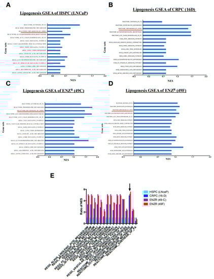 Lipid synthesis and particularly lipid metabolism are increased as prostate cancer evolves from HSPC to CRPC to ENZR CRPC. Graphs of gene set enrichment analysis of pathways implicated in lipid synthesis in HSPC cells (LNCaP) (A), CRPC cells (16D) (B), ENZR (49C) (C) and ENZR (49C) (D) (= 1). Fold change of NES (normalized enrichment score) of pathways implicated in lipid synthesis in CRPC cells and ENZR cells relative to HSPC cells. (E) The black arrow indicates change in genes related to lipid biosynthesis (Reactome Metabolism of lipids).