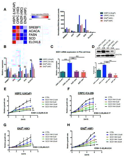 DNL is highly enhanced in CRPC and seems to be important in the PC aggressiveness and ENZ resistance. Heat map and graph showing RNA sequencing reads (RPKM) of genes implicated in DNL in HSPC cells (LNCaP), CRPC cells (16D) and ENZR cells (49C and 49F) (A); relative mRNA expression of genes implicated in DNL in HSPC cells (LNCaP), CRPC cells (C4-2B) and ENZR cells (49C and 49F) (B); relative mRNA expression (C) and protein expression (D) of SCD1 in HSPC cells (LNCaP), CRPC cells (16D) and ENZR cells (49C and 49F). Proliferation rates and percentage of cell proliferation of HSPC cells (LNCaP) (E), CRPC cells (C4-2B) (F), ENZR cells (49C) (G) and ENZR cells (49F) (H) were assessed using IncuCyte over six days of dose dependent treatment with the SCD1 inhibitor (SCD1 INH). The IC50 values of each cell line were calculated from dose–response curves using a GraphPad prism. Data represent the mean ± SD of three independent experiments. Data were analyzed using the one-way ANOVA test. * p < 0.05, ** p < 0.01, and *** p < 0.001.