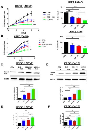 Based on the observed increase in DNL in CRPC and ENZR cell lines, we hypothesized that targeting combining an inhibitor of lipogenesis (SCD1 inhibitor) with Enzalutamide may provide a good strategy in HSPC and CRPC. Our data showed a significant decrease in the proliferation of the HSPC cell line (LNCaP) treated with ENZ or SCD1 inhibitor alone (Figure 3A, blue and red curves) while combination therapy was far superior inducing and a drastic decrease in cell proliferation (Figure 3A, green curve). On the other hand, this effect was not as remarkable in CRPC cells (Figure 3B, blue and red curves) compared to cells treated with combination therapy (Figure 3B, green curve). Higher levels of cell death were also observed in HSPC (Figure 3C,E) and CRPC (Figure 3D,F) cell lines treated with COMBO compared to ENZ or SCD1 INH treatment alone. This observation was confirmed by an increase in the protein expression of cleaved PARP, a marker of apoptosis (Figure 3E,F).