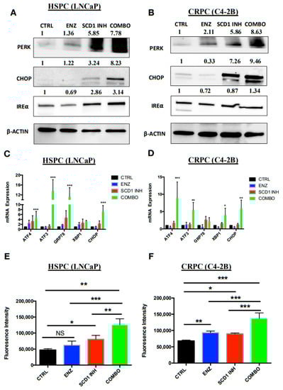 Previous studies have shown that inhibition of DNL in various cells induces ER stress and high levels of ROS production [19,22]. To confirm this, protein and mRNA expression of key markers of the different steps of ER stress were analyzed and the level of ROS production quantified to identify a similar phenotype in our cell lines. The COMBO treatment induced an increase in expression levels of the RE stress proteins PERK, CHOP and IRE⍺ in the HSPC cell line (LNCaP) (Figure 4A). However, in the CRPC (C4-2B) cells treated with COMBO, a substantial increase in PERK and CHOP expression was observed and a slight increase in the IRE⍺ expression levels (Figure 4B) compared to cells treated with ENZ or SCD1 INH alone. The mRNA expression of ER stress markers ATF3, ATF4, GRP78 and CHOP increased in HSPC (LNCaP) cells treated with COMBO as compared to ENZ or SCD1 INH alone (Figure 4C). In addition, a notable increase in ATF3, ATF4, XBP1 and CHOP was observed in CRPC (C4-2B) cells treated with COMBO as compared to ENZ or SCD1 INH alone (Figure 4D). Finally, compared to cells treated with ENZ or SCD1 INH alone, COMBO treatment induced a high level of cellular ROS in both HSPC (LNCaP) and CRPC (C4-2B) cells (Figure 4E,F).