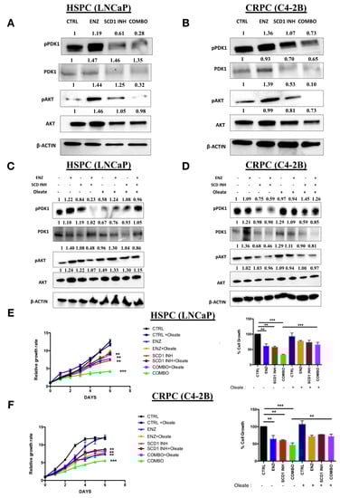 The PI3K/AKT pathway has a major role in PC proliferation and in the regulation of various metabolic processes including DNL [23]. Surprisingly, an increase in the phosphorylation of AKT and PDK1 was observed in both the HSPC (LNCaP) (Figure 5A) and CRPC (C4-2B) (Figure 5B) cells treated with ENZ treatment alone. In contrast, SCD1 INH treatment induced a decrease in the phosphorylation of AKT and PDK1 in HSPC (LNCaP) (Figure 5A) and CRPC (C4-2B) cells (Figure 5B). Importantly, COMBO treatment led to a strong inhibition of both AKT and PDK1 in the two cell lines (Figure 5A,B). This suggests that PC cells in the presence of ENZ treatment are still able to adapt via a molecular compensation by increasing the PI3K/AKT pathway. Our study also suggested that MUFA may play an important role in the regulation of the AKT pathway. To confirm this hypothesis, cells were treated with the same treatments (CONTROL, ENZ, SCID1 INH, COMBO) in the absence or presence of oleate, a major product of SCD1. Interestingly, the addition of oleate to the COMBO treatment induced a rescue of the phosphorylation of AKT and PDK1 in HSPC (LNCaP) (Figure 5C) and CRPC (C4-2B) cells (Figure 5D) as compared to COMBO treatment alone. More importantly, the addition of oleate to the medium of cells treated with COMBO restored cell proliferation as compared to COMBO treatment alone (Figure 5E,F). These results suggest that oleate may play an important role in the activation of PI3K/AKT pathway and that cancer cells require a minimal amount of oleate to proliferate.
