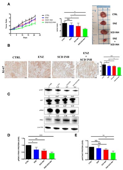 To validate our cell culture observations in a preclinical setting, the effects of different treatments were investigated in mouse models of PC. Murine xenografts were derived from C4-2B cells. A significant decrease in tumor growth was observed in mice treated with the combination of therapies (ENZ+SCD1 INH) as compared to untreated mice (CTRL) or mice treated with ENZ or SCD1 INH alone (Figure 6A). As observed in the cell lines, tumors of mice treated with the combination showed a marked decrease in the expression of the cell proliferation marker Ki67 as compared to those treated with ENZ or SCD1 INH alone (Figure 6B). The combination of therapies resulted in a decrease of AKT and PDK1 phosphorylation in the xenografts of mice treated with this combination as compared to those treated with ENZ and SCD1 INH alone (Figure 6C–E). This decrease is likely one of the key elements involved in the inhibition of proliferation and tumor growth.