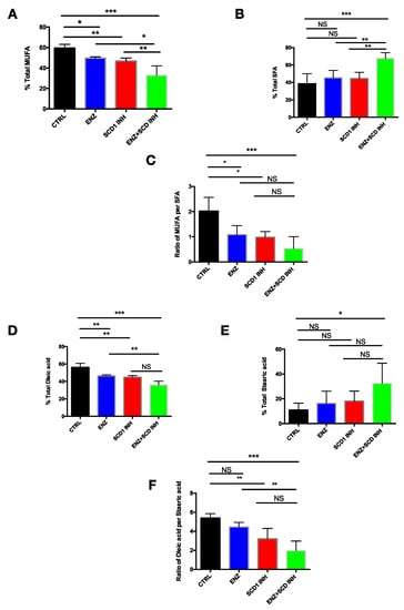 Combination of therapies induces changes in the monounsaturated and saturated fatty acids content in C4-2B xenograft models. (A) Percentage of total MUFA, (B) SFA and (C) ratio of MUFA/SFA in tumors after 21 days of treatment for CTRL, ENZ (20 mg/kg), SCD1 INH (30 mg/kg) or the combination groups; 3–5 tumors per group (randomly selected); (D) percentage of total oleic acid (C18:1), (E) stearic acid (C18:0) and (F) ratio of C18:1/C18:0 in C4-2B xenograft models after 21 days of treatment. NS: not significant. Data were analyzed using the one-way ANOVA test. * p < 0.05, ** p < 0.01, and *** p < 0.001.