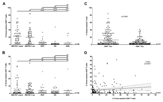 Antitumor-reactivity of tumor-infiltrating lymphocytes (TILs) across clinical cohorts and TIL sub-populations (in vitro, pooled data). (A) The proportion of tumor-reactive CD8+ TILs was significantly greater in Metastatic Melanoma (MM) cohorts compared to other tumor types, with no difference related to previous exposure to anti-PD-1 therapy (Mann–Whitney U test, p < 0.001). (B) The proportion of tumor-reactive CD4+ TILs was similar across all clinical cohorts (Mann–Whitney test, p > 0.05). (C) Comparing TIL subpopulations demonstrated that a greater proportion of CD8+ TILs were tumor-reactive compared to CD4+ TILs (Mann–Whitney test p < 0.0001, pooled clinical cohorts). (D) The proportion of tumor-reactive CD8+ TILs was only weakly correlated (Spearman r = 0.23, p = 0.0017) to the proportion of tumor-reactive CD4+ TILs in the same samples (pooled clinical cohorts). The solid line and dotted lines represent the best-fit regression line and 95% confidence interval, respectively. (A–D) In all panels, the recognition of TILs (Young TILs (Y TILs) and Rapidly Expanded TILs (REP TILs)) was tested against separate sets of autologous tumor cells (tumor cell lines (TCLs), TCLs + interferon gamma (IFNγ) or fresh tumor digests (FTDs)) and only the highest value reported. T cells were considered reactive if positive for at least one of TNF, IFNγ or CD107a, minus control. ** p < 0.01, *** p < 0.001, **** p < 0.0001, ns: no statistical significance.