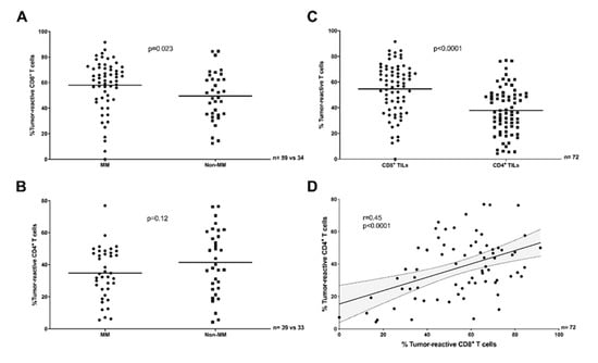 Antitumor-reactivity of TILs and tumor mutational burden in melanoma (pooled data). The proportion of tumor-reactive (A) CD8+ and (B) CD4+ TILs was not correlated (Spearman r = 0.21, p = 0.22 and Spearman r = 0.20, p = 0.25, respectively) to tumor mutational burden (TMB) (pooled MM clinical cohorts). The solid lines and dotted lines represent the best-fit regression line and 95% confidence interval, respectively. (A,B) In all panels, the recognition of TILs (Y TILs and REP TILs) was tested against separate sets of autologous tumor cells (TCLs, TCLs + IFNγ or FTDs) and only the highest value reported. T cells were considered reactive if positive for at least one of TNF, IFNγ, or CD107a, minus control.