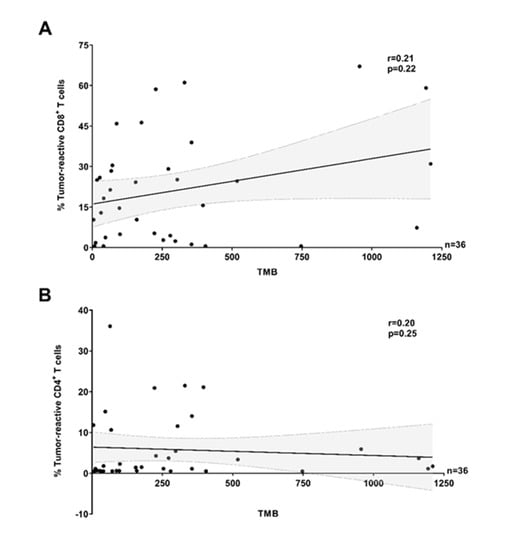 Although it is generally accepted that tumor types with a higher average TMB respond more frequently to immunotherapy [33,34], the value of TMB for predicting clinical outcome following immunotherapy within tumor types or subtypes is debated and several studies have failed to link TMB to immunological quantitative biomarkers in the TME [5,6,7,9]. On average, TMB is very high in melanoma, but the wide range observed highlights a high heterogeneity across patients [35]. Hence, we examined whether the high inter-sample variability in the proportion of tumor-reactive TILs across melanoma could be explained by the TMB of individual samples. Here, analysis of a smaller melanoma cohort (n = 36) did not show any obvious correlation between the proportion of tumor-reactive CD8+ or CD4+ TILs and TMB (Figure 3, data with TCL/TCL + IFNγ only are shown in Figure S9).