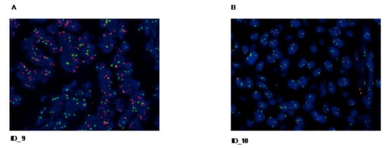 In this study, all six CDC cases that show positive IHC staining score (1+, 2+, 3+) for HER2 protein expression were tested by FISH to assess HER2 gene copy number (Table 2). FISH results were analyzed by counting the fluorescence signals in at least 20 malignant cells in two different areas of the section at 1000 magnification. For each case, the average HER2 copy number and the ratio of HER2 signals to chromosome 17 centromere (HER2/CEP17) signals were calculated according to the ASCO/CAP 2018. One out of six CDC patients with IHC 3+ was also HER2 FISH positive, showing an average HER2 copy number ≥4.0 (10.85) and a HER2/CEP17 ratio ≥ (5.63) (Figure 2A). The remaining 5/6 cases were regarded as HER2-negative exhibiting HER2/CEP17 ratio <2.0 with an average HER2 copy number <4.0 (Figure 2B). None of the cases analyzed showed HER2-equivocal results (HER2/CEP17 ratio <2.0 with an average HER2 copy number ≥4.0 and <6.0). Overall HER2 test was considered positive when the tumor specimens showed HER2 IHC 3+ or positive HER2 gene amplification by FISH. Considering together IHC and FISH results, we found that 2/26 cases (8%) were HER2 positive (Table 2)