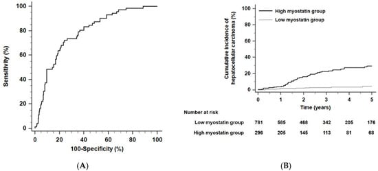 Regarding the performance of predicting 5-year HCC risk, the time-dependent AUROC of serum myostatin was 0.78 (sensitivity, 72.3%; specificity, 72.1%; positive predictive value 25.2%; negative predictive value 95.3%; 95% CI, 0.71–0.84; Figure 1A) and the time-dependent AUROC of serum myostatin for 3-year HCC risk was 0.79 (sensitivity, 74.7%; specificity, 75.2%; positive predictive value 20.8%; negative predictive value 97.2%; 95% CI, 0.72–0.85). The total population was divided into two groups (a low myostatin group and a high myostatin group) using a cutoff point of 4.97 ng/mL, which provided the maximum sum of the specificity and sensitivity in being able to predict the risk of HCC development within 5 years. Patients with low serum myostatin levels were classified into the low myostatin group (<4.97 ng/mL, n = 781), and those with high serum myostatin levels were classified into the high myostatin group (≥4.97 ng/mL, n = 296).