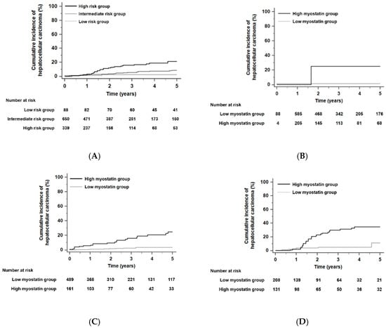 When the HCC risk of all patients was stratified according to the THRI [29], the 5-year risk of developing HCC was significantly different among the different risk groups (p < 0.001 by the log-rank test, Figure 2A): HCC developed within 5 years in 2.3% of patients in the low-risk group (n = 88), 4.9% of patients in the intermediate-risk group (n = 650), and 11.2% of patients in the high-risk group (n = 339) according to the THRI stratification. The time-dependent AUROC of the THRI for 5-year HCC risk was 0.72 (95% CI, 0.65–0.78). In each risk group, HCC risk was significantly different according to serum myostatin levels. In each risk group stratified by the THRI, patients with high myostatin levels had significantly higher HCC risk than those with low myostatin levels. The HR was 18.89 in the low-risk group with a 95% CI of 1.18–303.25 (p = 0.04, Figure 2B), the HR was 6.65 in the intermediate-risk group with a 95% CI of 3.38–13.08 (p < 0.001, Figure 2C), and the HR was 4.01 in the high-risk group with a 95% CI of 1.96–8.22 (p < 0.001, Figure 2D). In competing risk analyses, patients with high myostatin levels also had significantly higher HCC risk than those with low myostatin levels in each risk group stratified by the THRI. The HR was 19.89 in the low-risk group with a 95% CI of 1.59–248.50 (p = 0.02), the HR was 5.85 in the intermediate-risk group with a 95% CI of 2.99–11.45 (p < 0.001), and the HR was 4.41 in the high-risk group with a 95% CI of 2.12–9.16 (p < 0.001).