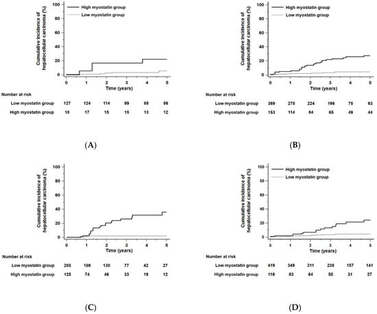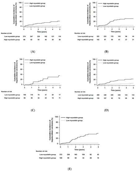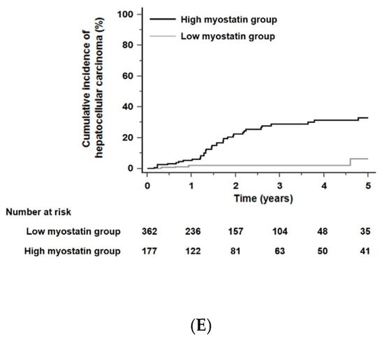 When the total patient population of this study was divided according to a median fibrosis-4 (FIB-4) score [31] of 6.46, the 5-year risk of developing HCC in patients with a high FIB-4 score (>6.46) was significantly higher than that in those with a low FIB-4 score (≤6.46; HR = 2.20, 95% CI = 1.37–3.53, p = 0.001): HCC developed within 5 years in 5.2% of patients in the low FIB-4 scores group (n = 538) and 8.2% of patients in the high FIB-4 scores group (n = 539). Irrespective of low or high FIB-4 score groups, patients with high serum myostatin levels had higher HCC risks compared with those with low serum myostatin levels. The HR was 5.18 among patients with low FIB-4 scores (≤6.46) with a 95% CI of 2.47–10.85 (p < 0.001, Figure 4D), and the HR was 9.53 among patients with high FIB-4 scores (>6.46) with a 95% CI of 4.26–21.33 (p < 0.001, Figure 4E).
