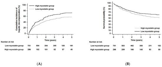 The cumulative incidence rates with developing any hepatic decompensation event or liver-related death within 5 years were 54.5% (n = 587) and 34.8% (n = 375), respectively. Patients in the high myostatin group were more likely to develop any hepatic decompensation event than those in the low myostatin group, who were used as a reference. (HR 1.47, 95% CI 1.23–1.75, p < 0.001, Figure 5A). Similarly, the risk of liver-related death significantly increased in the high myostatin group compared with the low myostatin group (HR 1.34, 95% CI 1.12–1.62, p = 0.02, Figure 5B).