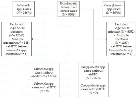 de Savornin Lohman, E.; Duijster, J.; Groot Koerkamp, B.; van der Post, R.; Franz, E.; Mughini Gras, L.; de Reuver, P. Severe Salmonella spp. or Campylobacter spp. Infection and the Risk of Biliary Tract Cancer: A Population-Based Study. Cancers 2020, 12, 3348. https://doi.org/10.3390/cancers12113348