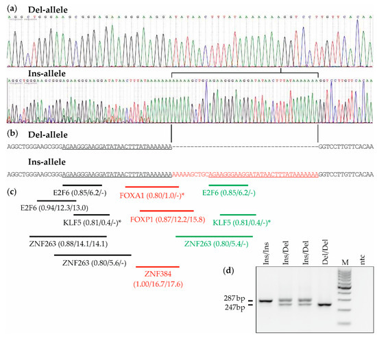 We next performed in silico analyses of putative transcription factor binding sites around the rs150550023 site, applying JASPAR, CIS-BP, and The Human Protein Atlas databases [48,49,50]. We found predicted binding sites for FOXA1, FOXP1 (Forkhead Box Proteins A1 and P1) [51,52], and ZNF384 (Zinc Finger Protein 384) [53] unique to the Ins-allele, and binding sites for E2F6 (E2F Transcription Factor 6) [54], KLF5 (Krueppel-like Factor 5) [55], and ZNF263 (Zinc Finger Protein 263) [56] both in the Ins- and the Del-allele, but with one extra binding site each in the Ins-allele (Figure 1c). The highest binding scores could be confirmed with CIS-BP, an independent analysis tool [50]. A previous JASPAR analysis has focused on the breakpoint of the Del-allele (AAAAAAA/GGTCCTT) [30], which, however, is also present in the Ins-allele (Figure 1a,b). In fact, due to the 30-bp duplication there is no sequence that is unique to the Del-allele and absent from the Ins-allele; only sequence unique to the Ins-allele exists (Figure 1a,b). Genotyping was done by PCR and agarose gel electrophoresis. Representative examples of the obtained PCR bands of all three genotypes are shown in Figure 1d.