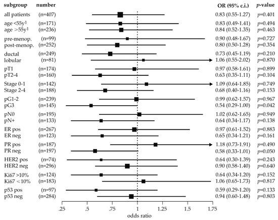 The potential association of rs150550023 with breast cancer risk in clinically and histo-pathologically relevant subpopulations has not been thoroughly investigated so far [30,31,32,33]. In contrast, associations with the age at onset, estrogen receptor (ER) status, p53 status, and Ki67-status have been demonstrated for SNP309 [17,18,21,58,59,60]. Accordingly, we explored whether associations of rs150550023 with breast cancer risk in these and other clinically relevant subpopulations exist, and determined ORs in the recessive genetic model (Del/Del vs. Ins/Ins + Ins/Del). This analysis revealed considerable differences in the odds ratios in subgroups stratified by tumor size (pT1 vs. pT2-4), stage (0–1 vs. 2–4), grade (pG1–2 vs. pG3), progesterone receptor (PR) status, Ki67 status (≤10% vs. >10% Ki67-positive tumor cells), and p53 status (Figure 2). Moreover, odds ratios tended to be lower in subgroups associated with advanced disease and a poor prognosis, such as pT2–4, stage 2–4, pG3 tumors with a negative estrogen and progesterone status and a positive HER2 and p53 status (Figure 2). However, only two of these associations were marginally significant: in high grade (pG3) tumors (OR, 0.54; 95% c.i., 0.29–1.00; p = 0.042), and in PR negative tumors (OR, 0.58; 95% c.i., 0.33–1.01; p < 0.05; Figure 2).