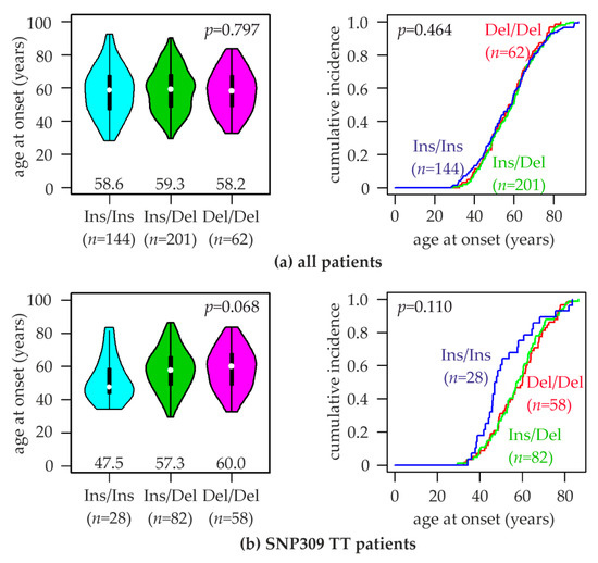 Association of rs150550023 genotypes with the age at breast cancer onset. Violin plots (left) and curves of the cumulative breast cancer incidence (right) of the indicated age at onset are shown for (a) all patients of the study population, and (b) patients with the SNP309TT genotype. rs150550023 genotypes (Ins/Ins, Ins/Del, Del/Del) and numbers of patients (n) are indicated. Numbers in left panels represent the median age at breast cancer onset of each genotype (indicated by white dots). p-values (p) in left panels were calculated with ANOVA, and in right panels with log-rank tests.