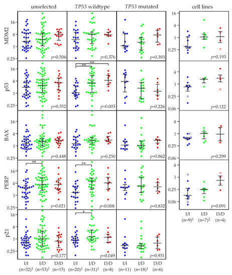 Association of rs150550023 genotypes with the expression of p53 target genes in human breast cancer. Strip charts of MDM2, p53, BAX, PERP, and p21 relative mRNA levels of breast tumors and cell lines, normalized to ß-actin. Results for unselected patients, patients with wildtype TP53, patients with mutated TP53, and breast cancer plus untransformed mammary epithelial cell lines (the latter indicated with open circles) are shown. Genotypes (Ins/Ins [I/I], Ins/Del [I/D], Del/Del [D/D]) and numbers of patients (n) are indicated. Horizontal lines indicate the first, second (i.e., median), and third quartiles. All p-values (p) indicated were calculated with ANOVA. Note that y-axes are logarithmic (log [2]). 1 The number of patients and cell lines is 1–2 lower than indicated in some of the panels due to unsuccessful qRT-PCR in some samples. 2 Expression of p53 was successfully determined in three instead of seven cell lines with genotype Ins/Del. * p < 0.05; ** p < 0.01 in comparisons of two groups; unpaired, two-sided t-tests.