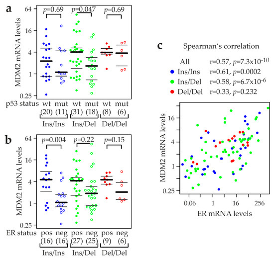 Next, we analyzed the combined effects on MDM2 mRNA expression of rs150550023 genotype and p53 status as well as estrogen receptor (ER) status (Figure 5). Mean and median MDM2 levels of tumors with a mutated TP53 were clearly lower than in TP53 wildtype tumors in patients with the Ins/Ins genotype (mean, 1.2× lower; median, 2× lower; p = 0.69; unpaired, two-sided t-test) and the Ins/Del genotype (mean, 2× lower; median, 2.4× lower; p = 0.047), but were only slightly reduced in patients with the Del/Del genotype (mean, 1.16× lower; median, 1.04× lower; p = 0.69; Figure 5a).