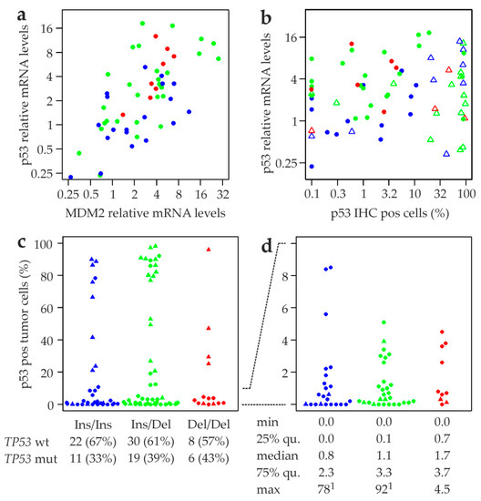 The rate of TP53 mutation was non-significantly elevated in Del/Del tumors, which was, however, not confirmed by p53 IHC status of the complete study population (Figure 6c; Table S1). Since p53 protein levels in tumors with a mutated TP53 are thus not the result of physiological regulation, we focused our analysis on TP53 wildtype tumors, in which we found a marginally significant positive correlation between p53 mRNA levels and p53 IHC positive cells (ρ = 0.3, p = 0.05; Figure 6b). This correlation was strongest in Ins/Ins tumors (ρ = 0.46, p = 0.1), weaker in Ins/Del tumors (ρ = 0.19, p = 0.4; Figure 6b), and weakest in Del/Del tumors (ρ = 0.14, p = 0.8; Figure 6b). In this TP53 wildtype subpopulation, we found that Del/Del tumors exhibit considerably higher average p53 mRNA levels than Ins/Ins tumors, but without a correspondingly higher number of p53 protein positive cells (Figure 6b). Thus, Del/Del tumors appear to require higher levels of p53 mRNA to attain comparable levels of p53 protein. Like p53 and MDM2 mRNA levels, the number of p53 positive cells was in a narrower range in Del/Del tumors compared to Ins/Ins and Ins/Del tumors (Figure 6b–d). TP53 wildtype Del/Del tumors had a maximum of 4.5% p53 positive cells; all tumors with a higher fraction had a mutated TP53 (Figure 6c,d). Whereas the majority of Ins/Ins and Ins/Del tumors with >10% p53 positive cells also had a mutated TP53 gene, we observed 2/22 tumors with wildtype TP53 and >10% p53 positive cells in Ins/Ins tumors (maximum, 78%), and 6/30 Ins/Del tumors (maximum, 92%; Figure 6c,d). On the other hand, we also found a large fraction of tumors with the Ins/Ins and Ins/Del genotype with no or almost no p53 positive cells, which was not observed in Del/Del tumors (Figure 6d). In spite of the lower maximum of p53 positive cells in Del/Del tumors, the median, 25% and 75% quantiles were actually highest in Del/Del tumors and lowest in Ins/Ins tumors (Figure 6d).