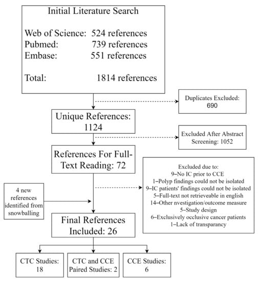 All eight CCE studies were included for the completion rate analysis, although one was excluded for complete colonic view [39], as it did not clearly define how this was ensured. Eleven CTC studies were included for the completion rate analysis (Figure 2). Nine CTC studies were excluded from the completion rate analysis, as they did not explicitly report a completion rate or absolute numbers of incomplete/complete investigations [1,21,22,23,24,26,33,36,37].