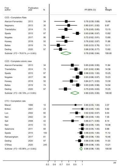 Forest plot for the completion rates of colon capsule endoscopy and CT colonography following incomplete colonoscopy. PP: estimated prevalence proportion. Complete colonic view: CCE investigations complete or overlapping with the most proximal point of a previous incomplete colonoscopy.