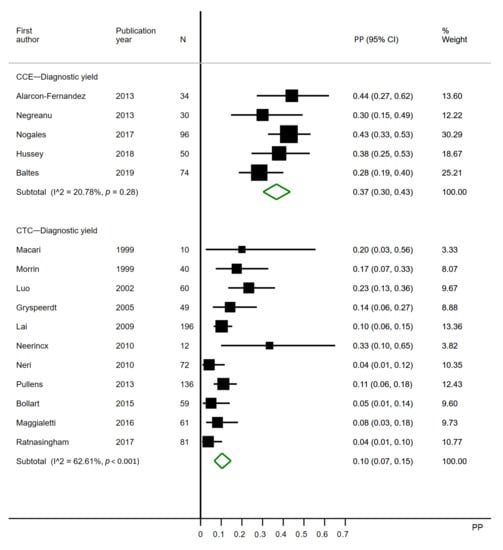 Limiting the analyses to studies published after 2009 caused no change in relation to the effect for CCE, but in the CTC analysis, five studies were further excluded, and the pooled estimate was reduced to 0.07 (95% CI 0.03–0.12).