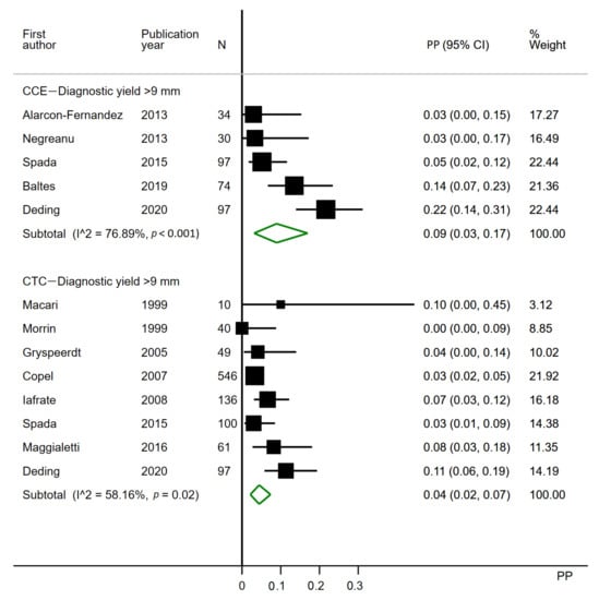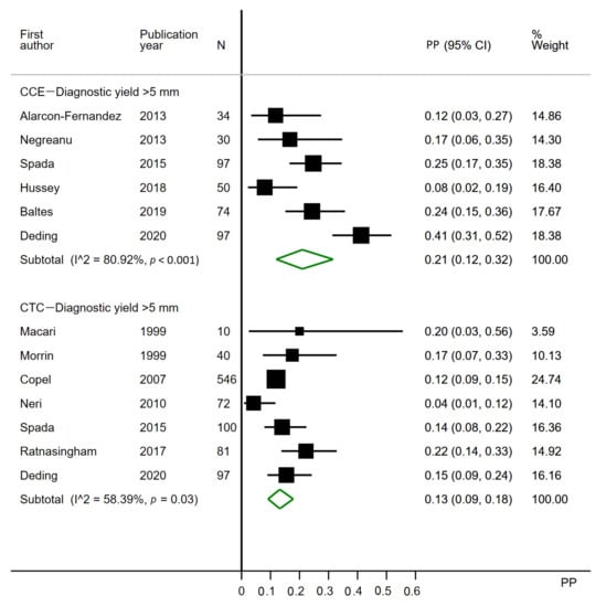Five CCE studies were included for the analysis (Figure 3). Two CCE studies were excluded, as they did not report polyps <6 mm [4,5], and one study did not report the polyps per patient [3]. Eleven CTC studies were included for the analysis. Three CTC studies were excluded, as they did not report polyps <6 mm [4,5,36]; one study only reported polyps >9 mm [37], and five studies did not report polyps at all [28,29,30,32,38].