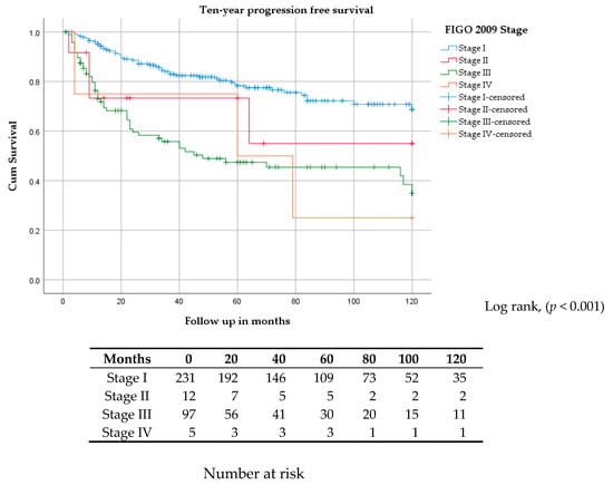 Kaplan–Meier curve for ten-year progression-free survival stratified by FIGO stage.