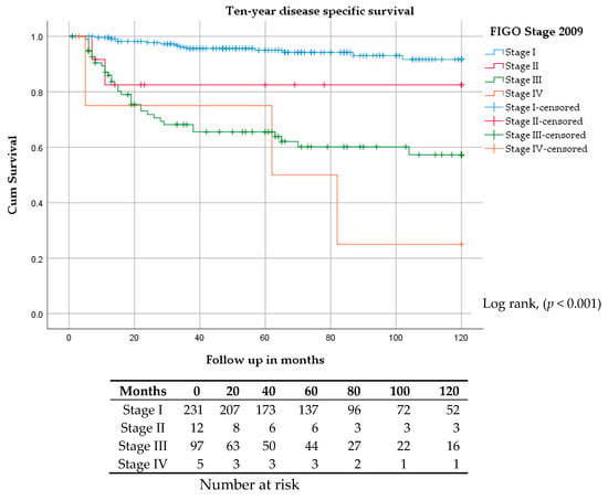 Kaplan–Meier curve for ten-year disease-specific survival stratified by FIGO stage.