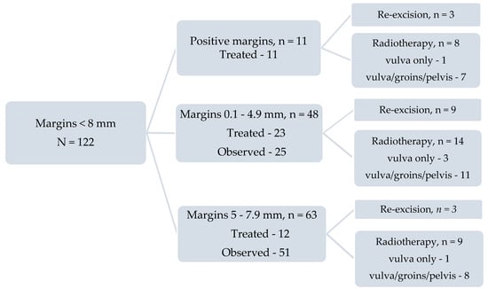 To determine the relationship between peripheral margin distance and vulvar recurrence, patients with less than six months follow-up, none of whom had a vulvar recurrence, were excluded (n = 4). Of the remaining 341 patients, 219 (64.2%) had a histopathological margin distance ≥8 mm, 111 (32.5%) had a margin between 0.1 mm and 8 mm (close margins) and 11 (3.2%) had positive margins. Of the 111 patients with close margins, 48 patients had a margin between 0.1 mm and <4.9 mm, and 63 between 5 mm and 7.9 mm (Table S1). Of the 122 patients with close or positive margins, 46 (37.7%) were treated by re-excision or adjuvant radiation therapy and 76 (62.3%) were observed. The relationship between surgical margins and subsequent management is shown in Figure 3 and Table S1. All ‘surgical margins’ or ‘margins’ referred to in this paper are the histopathological surgical margin distance as measured by the pathologist and recorded in the histopathology report.