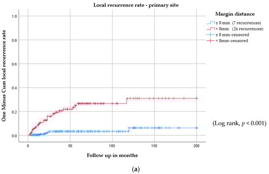 There were 27 vulvar recurrences in patients with margins < 8 mm, of which 26 were at the primary site, and one was at a remote site (p < 0.001). Of the 51 recurrences in patients with margins ≥ 8 mm, 44 were at a remote site and seven were at the primary site (p < 0.001) (Figure 4, Table S1).