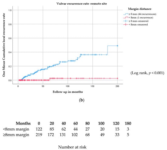 Vulvar recurrence rate for (a) the primary site and (b) the remote site stratified by surgical margins of <8 mm and ≥8 mm.