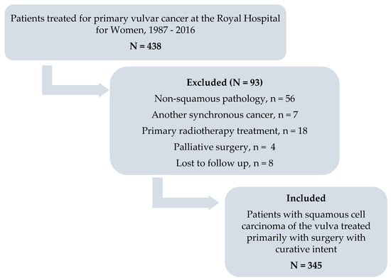 This study was a retrospective review of patients with squamous cell carcinoma of the vulva, treated primarily with surgery with curative intent, at the Royal Hospital for Women, Sydney. The study was conducted in accordance with the Declaration of Helsinki, and the protocol was approved by the South Eastern Sydney Local Health District Human Research Ethics Committee (Reference number: 15/151(LNR/POWH/311). The departmental database was reviewed for consecutive patients treated for primary carcinoma of the vulva between February 1987 and December 2016 (n = 438). Figure 5 describes the inclusion and exclusion criteria for the study group. Demographic, clinical, surgical, histopathological, 2009 FIGO staging and outcome data were extracted from the hospital’s medical records. Patients were followed until death from any cause, or until the end of data extraction on 31 July 2019.