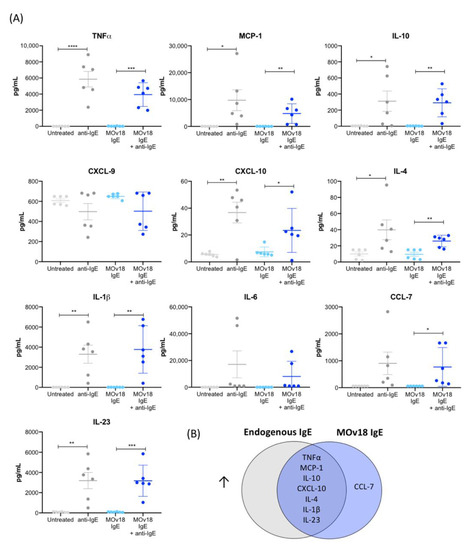 IgE cross-linking on the surface of monocytes triggers increased pro-inflammatory cytokine and chemokine release. (A) Cytokine and chemokine production measured in cell culture supernatants following cross-linking of IgE on the surface of primary monocytes isolated from healthy volunteer blood (n = 6). (B) Venn diagram of the cytokines and chemokines that were significantly upregulated upon cross-linking of endogenous or MOv18 IgE, or both. Error bars represent standard error of mean (SEM) (independent experiments). A one-way ANOVA with Tukey’s post-hoc test was performed to assess significance (* p < 0.05; ** p < 0.01; *** p < 0.001; **** p < 0.0001).