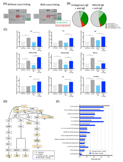 IgE engagement and FcεRI downstream signalling have been widely studied in mast cells [26,27], but not in monocytes. Here, kinase phosphorylation levels were investigated in monocytes after cross-linking of FcεRs partially occupied by endogenous IgE or saturated by MOv18 IgE. Kinase phosphorylation was measured in a phospho-kinase array (Figure 3A), and values were represented as fold-changes in pixel density in relation to the unstimulated “no antibody” control. Of the 43 protein kinases studied, ~40% showed enhanced phosphorylation of ≥20% change with one or both IgE cross-linking conditions (green segments, Figure 3B). We found protein kinases described to be downstream of the tetrameric FcεRI on mast cells and basophils to be phosphorylated with IgE stimulation on monocytes: Lyn and Fgr showed a two-fold increase in phosphorylation with endogenous IgE and with additional MOv18 IgE cross-linking (Figure 3C). Fyn phosphorylation, also a known FcεRI-related kinase, was significantly upregulated by two-fold with MOv18 IgE cross-linking as was phosphorylation of Lck and Yes, which can substitute Fyn [28,29,30] (Figure 3C). The phosphorylation of other kinases not classically known to belong to the tetrameric FcεRI pathway, such as STAT5a, STAT5b, and β-catenin, was also increased by 1.3 to 2.3-fold upon IgE cross-linking. From these findings, the monocytic-FcεRI signalling pathway was mapped and updated based on the equivalent network in mast cells and basophils (Figure 3D, Table S1). Furthermore, Reactome pathway enrichment revealed other potential signalling pathways, such as FcγR activation and CD28 co-stimulation, largely belonging to immune cell activation, stimulation, and antigen presentation processes, to be implicated following IgE-FcεRI cross-linking (Figure 3E, Table S2).