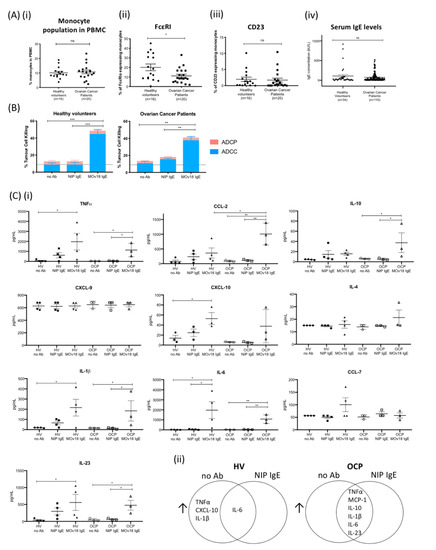 IgE potentiates cancer cell antibody-dependent cellular cytotoxicity (ADCC) and immune mediator release by monocytes from healthy volunteers and ovarian cancer patients. (A) (i) Proportions of monocytes within total PBMC of healthy volunteers and ovarian cancer patients. Comparison of (ii) FcεRI- and (iii) CD23-expressing monocyte proportions in healthy volunteers (n = 16) and patients (n = 20). (iv) Total serum IgE concentration measured in healthy volunteers (n = 34) and patients with ovarian cancer (n = 110). (B) MOv18 IgE potentiated in vitro killing of target IGROV1 ovarian cancer cells (compared with no antibody (no Ab) and isotype (NIP IgE) controls) by primary monocytes isolated from healthy volunteers (left, n = 4) and patients (right, n = 3) (independent experiments). (C) Cytokine and chemokine levels measured in cell culture supernatants from IgE-mediated ADCC/ADCP assays with primary monocytes (Luminex). (i) Quantitative analyses of immune mediators measured in the supernatants of ADCC/ADCP assays with monocytes from healthy volunteers (HV) (n = 4) and from patients with ovarian cancer (OCP) (n = 3) as effector cells (data from independent experiments). (ii) Venn diagrams of secreted mediators increased in supernatants from ADCC/ADCP assays with primary monocytes from healthy volunteers (left, n = 4) and from patients (right, n = 3) as effector cells: comparisons between MOv18 IgE treatment versus no antibody (no Ab) and MOv18 IgE treatment versus isotype NIP IgE controls (NIP IgE); upregulated cytokines by MOv18 IgE versus both NIP IgE and no Ab controls are shown for each human donor group. Error bars represent standard error of mean (SEM) of independent experiments. (A) A Student’s t-test and (B,C) one-way ANOVA with Tukey’s post-test were performed to assess significance (* p < 0.05; ** p <0.01; *** p < 0.001).
