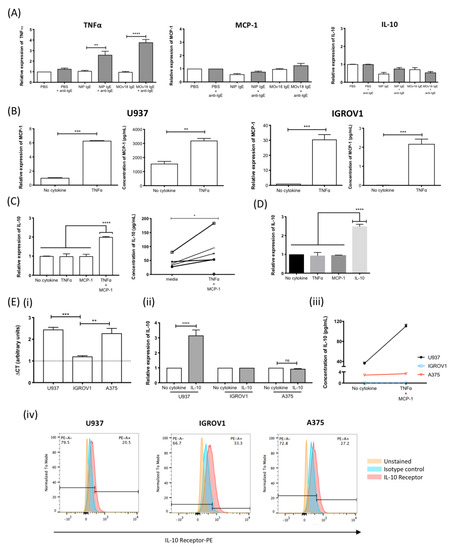 Cross-linking IgE antibodies of various antigen specificities on the surface of human monocytic U937 cells resulted in up to three-fold increase in TNFα expression. However, IgE cross-linking alone did not trigger MCP-1 or IL-10 upregulation (Figure 5A). When monocytic cells were stimulated with TNFα, this resulted in a six-fold upregulation of mRNA expression and a two-fold increased secretion of MCP-1 (Figure 5B, left). Similarly, TNFα upregulated MCP-1 on human ovarian cancer IGROV1 cells (Figure 5B, right). Furthermore, when monocytes were stimulated with TNFα and MCP-1 combined, IL-10 expression and secretion increased by two-fold and 2.5-fold, respectively (Figure 5C). Stimulating monocytic cells with IL-10 alone also triggered a 2.5-fold increase in IL-10 expression (Figure 5D, Figure S6). To determine the cellular source of IL-10, baseline IL-10 mRNA expression in monocytic U937, ovarian cancer IGROV1 and an additional cancer cell line (melanoma A375) was interrogated by qPCR. IGROV1 cells had significantly lower baseline IL-10 expression compared with U937 or A375 (Figure 5(Ei)). Only U937 cells responded to IL-10 (Figure 5(Eii)) or TNFα and MCP-1 combination stimulation (Figure 5(Eiii)) to upregulate IL-10, despite all cell types expressing the IL-10 receptor (Figure 5(Eiv)).