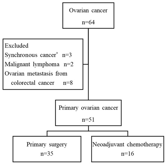 A total of 64 patients with ovarian cancer were initially enrolled. Thirteen patients were excluded due to the final pathological diagnosis of synchronous cancer accompanied by other cancers (n = 3), malignant lymphoma (n = 2), or metastatic carcinoma from colorectal cancer (n = 8). The remaining 51 patients were eligible for the study. Of the 51 patients, 35 patients (69%) were treated by primary surgery and 16 (31%) were treated with neoadjuvant chemotherapy (NAC) (Figure 1).