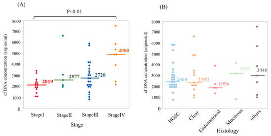 Plasma cell-free DNA (cfDNA) concentration according to disease stage and histological type in ovarian cancer. (A) Concentration of circulating tumor DNA (ctDNA) in stage IV was significantly higher compared with stage I (p < 0.01). (B) There were no significant differences in the level of ctDNA concentration among histological subtypes. HGSC: high grade serous carcinoma.